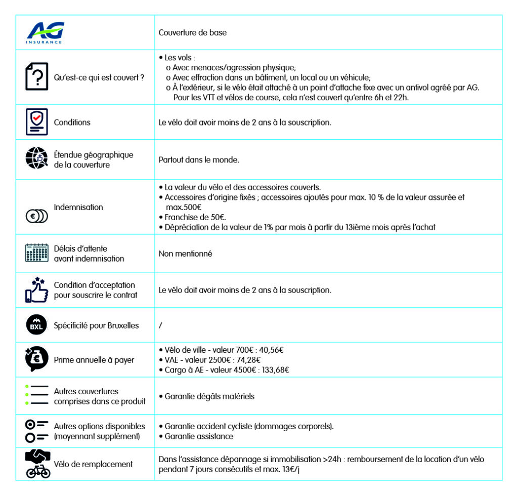 Le contrat est conclu pour une durée d’un an. Il est tacitement reconduit par période d’un an. Le contrat peut se conclure via un courtier AG Insurance, ou via BNP Parias Fortis. Ces données datent de mai 2024 et ne se veulent pas exhaustives.
