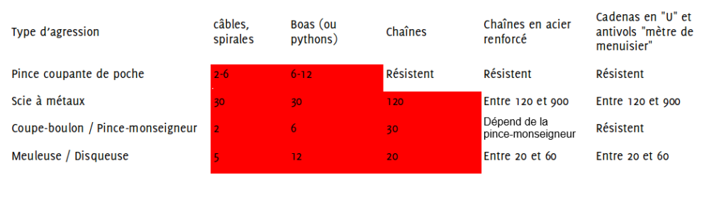 Afin de vous faire une idée, le tableau ci-dessous vous indique la durée moyenne de résistance des antivols pour vélo, en secondes :