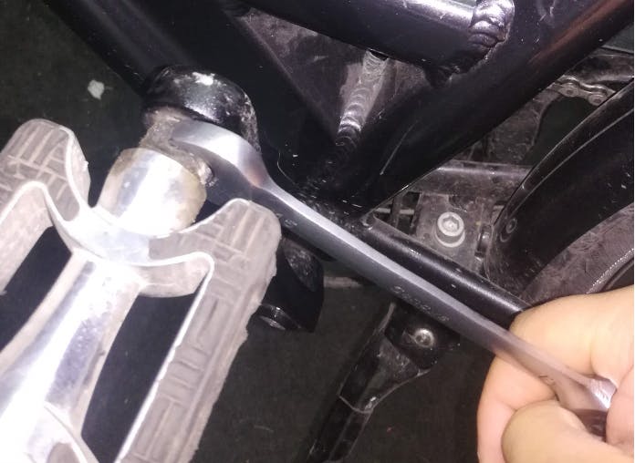 Don’t panic! This sounds a lot more technical than it actually is! Use a size 15 spanner to unscrew the pedals. Turn clockwise to remove the left peddle and anticlockwise to remove the right peddle. The pedals are usually screwed on quite tightly, but if you use a long spanner, you’ll see you can loosen them easily with a little effort. The only reason why the pedals should be removed is to make using the bike more comfortable. You can still use the draisienne method with pedals, but this will be quite tough on your shins.