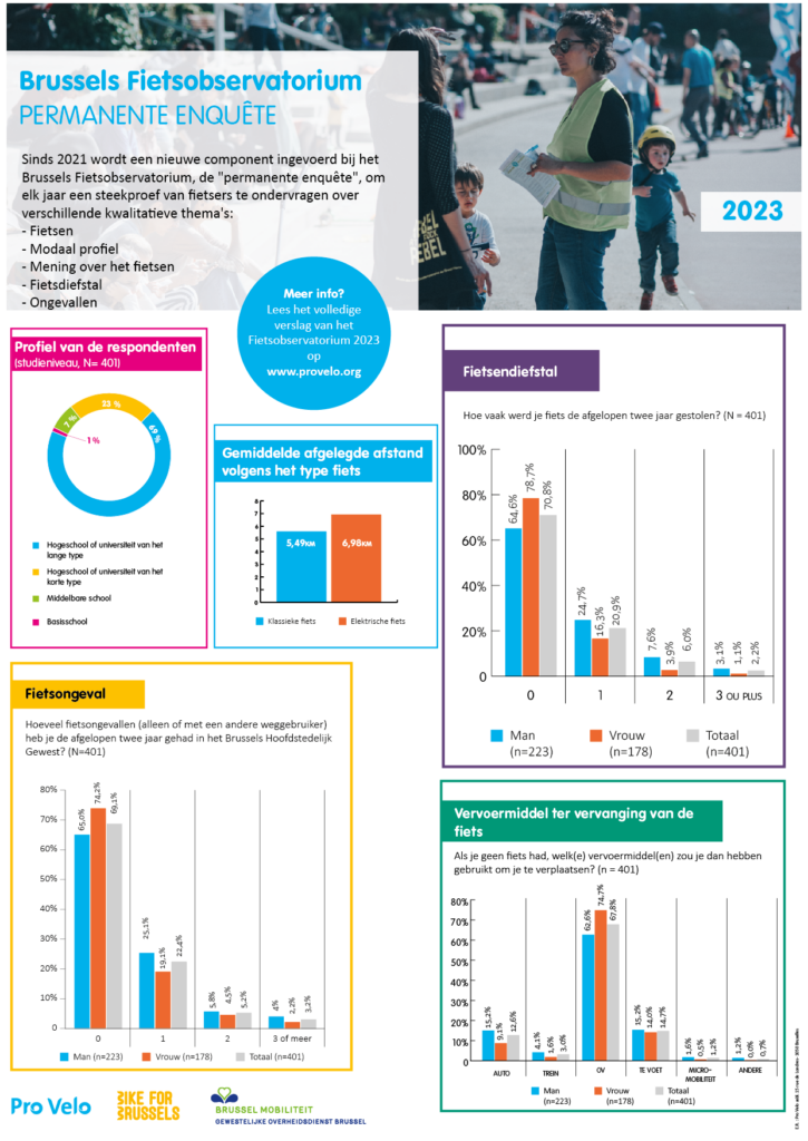 Ook dit jaar wordt het Fietsobservatorium aangevuld met de “permanente enquête”. Deze enquête maakt sinds 2022 deel uit van het verslag waarbij een steekproef van fietsers ondervraagd over hun fietsgewoonten (bijvoorbeeld afstand, redenen en reistijden, type fiets), hun modaal profiel (bijvoorbeeld gebruikte vervoerswijzen, frequentie) en hun ervaring over fietsen in Brussel (bijvoorbeeld infrastructuur en veiligheid).