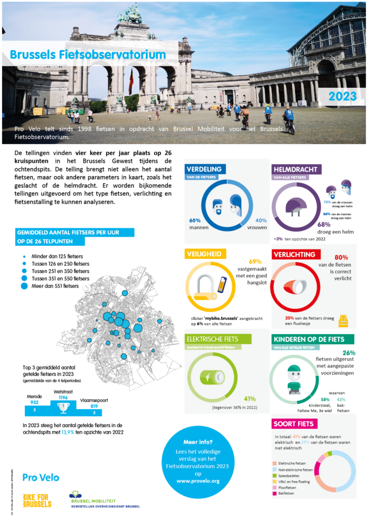 Op vraag van het Hoofdstedelijk Gewest telt Pro Velo sinds 1998 fietsers op de Brusselse wegen. Deze tellingen worden uitgevoerd in het kader van het Brussels Fietsobservatorium en vinden vier keer per jaar op vaste plaatsen plaats. Dit staat ons toe trends te analyseren. Naast het aantal fietsers, kijken we ook naar specifieke eigenschappen (geslacht, selfservice-fietsen, verlichting, al dan niet elektrisch, helmdracht) en evalueren we de parkeergelegenheid en -diefstalveiligheid.
