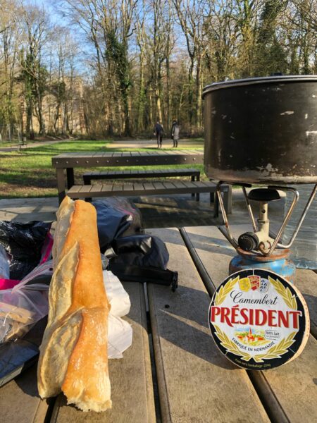 Ookal is hij helemaal geen beginnende fietser, deze voorbereidende tocht was een uitgesproken gelegenheid om de spullen uit te testen en na te denken over wat hij moest inpakken! Zoals vaak het geval is aan het einde van een avontuur, zijn sommige spullen in de fietstassen gebleven: een hangslot als extra beveiliging of een gsp-bevestiging, bijvoorbeeld. Bij avontuur gaat het erom dat je je op het moment zelf kunt aanpassen, en soms gaat het er ook om dat je een paar extra aankopen doet, zoals een kachel die aan vervanging toe is, een nieuwe band, enz.